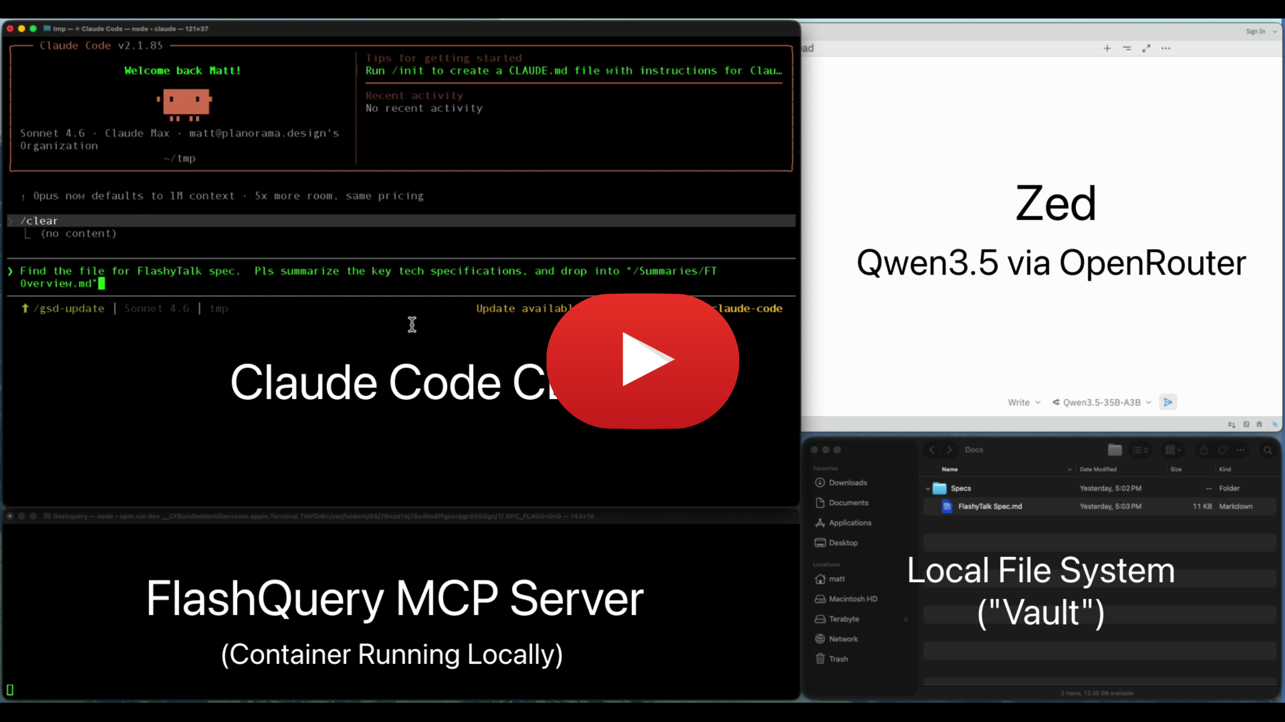 FlashQuery runs locally. The CRM and Product Brain plugins are the two shipping plugins. Here's what a working session looks like.